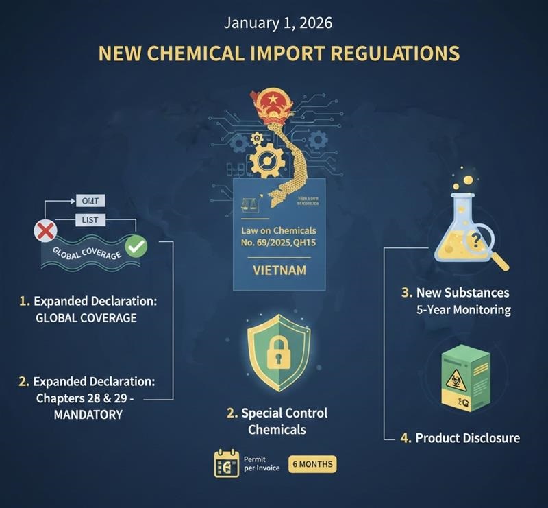 Mandatory Declaration: All imported materials classified under Chapter 28 (Inorganic Chemicals) and Chapter 29 (Organic Chemicals) of the Vietnam Nomenclature of Exports and Imports must now be declared through the "National Single Window," regardless of whether they are on specific control lists.